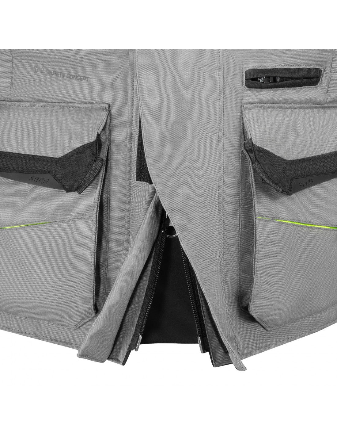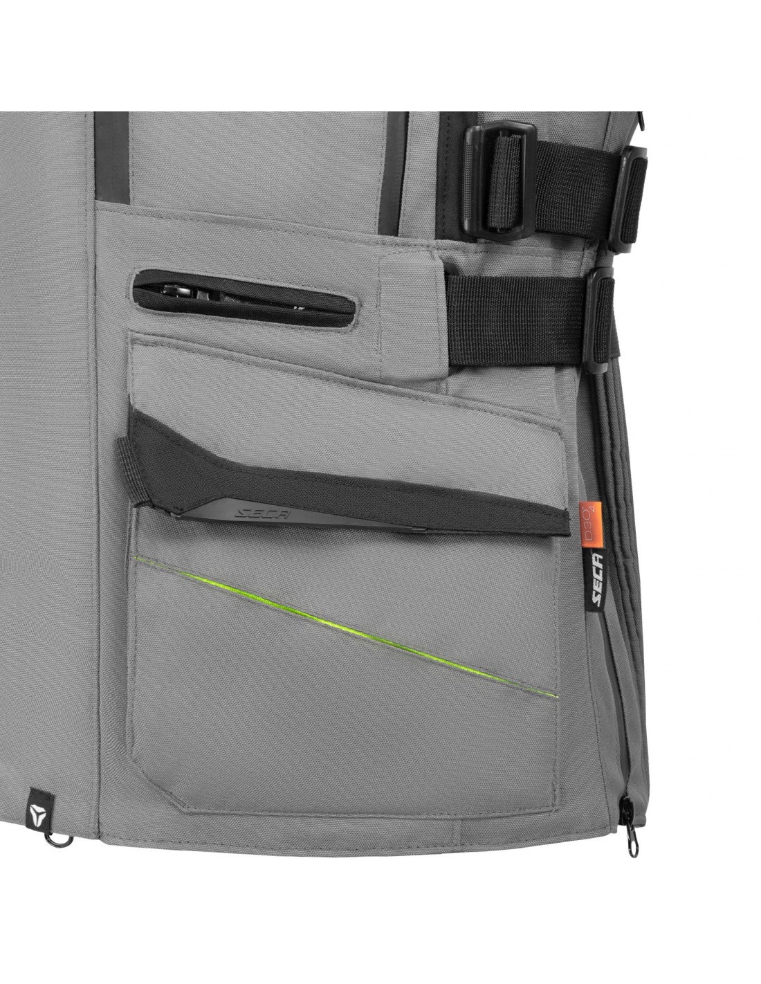 Predná časť: 5 vreciek vrátane 2 vodotesných vreciek na náklad, 2 bočné vrecká so zapínaním na patentky (za nákladnými vreckami), 1 vrecko na kľúče so zipsom (nad nákladnými vreckami)